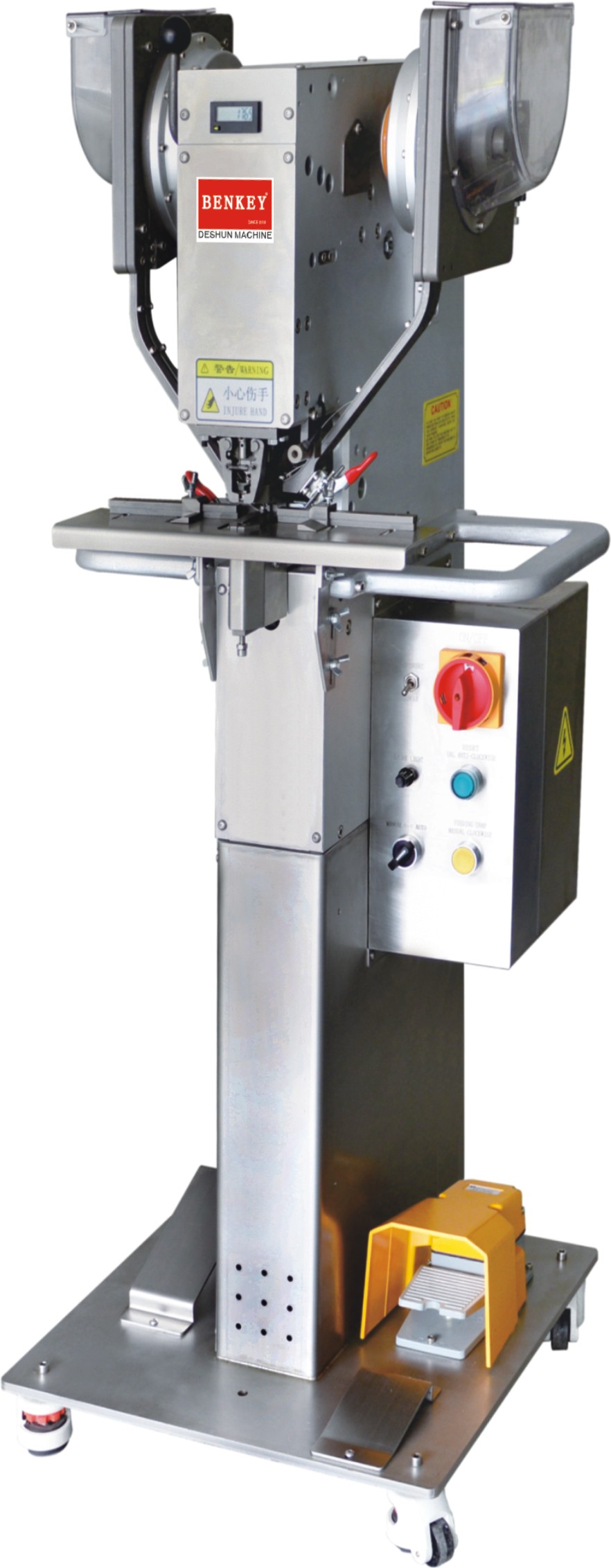 說眀:把鈕扣放進對應的2個料斗,開機會自動轉動料斗,自動把鈕扣排滿軌道,自動把鈕扣送到上下模具,伺服電機驅動,只要踩下踏腳開關便可裝訂自如,簡單易用。上下模具對向運動穿透力好。更換配件可以裝訂其它鈕扣。